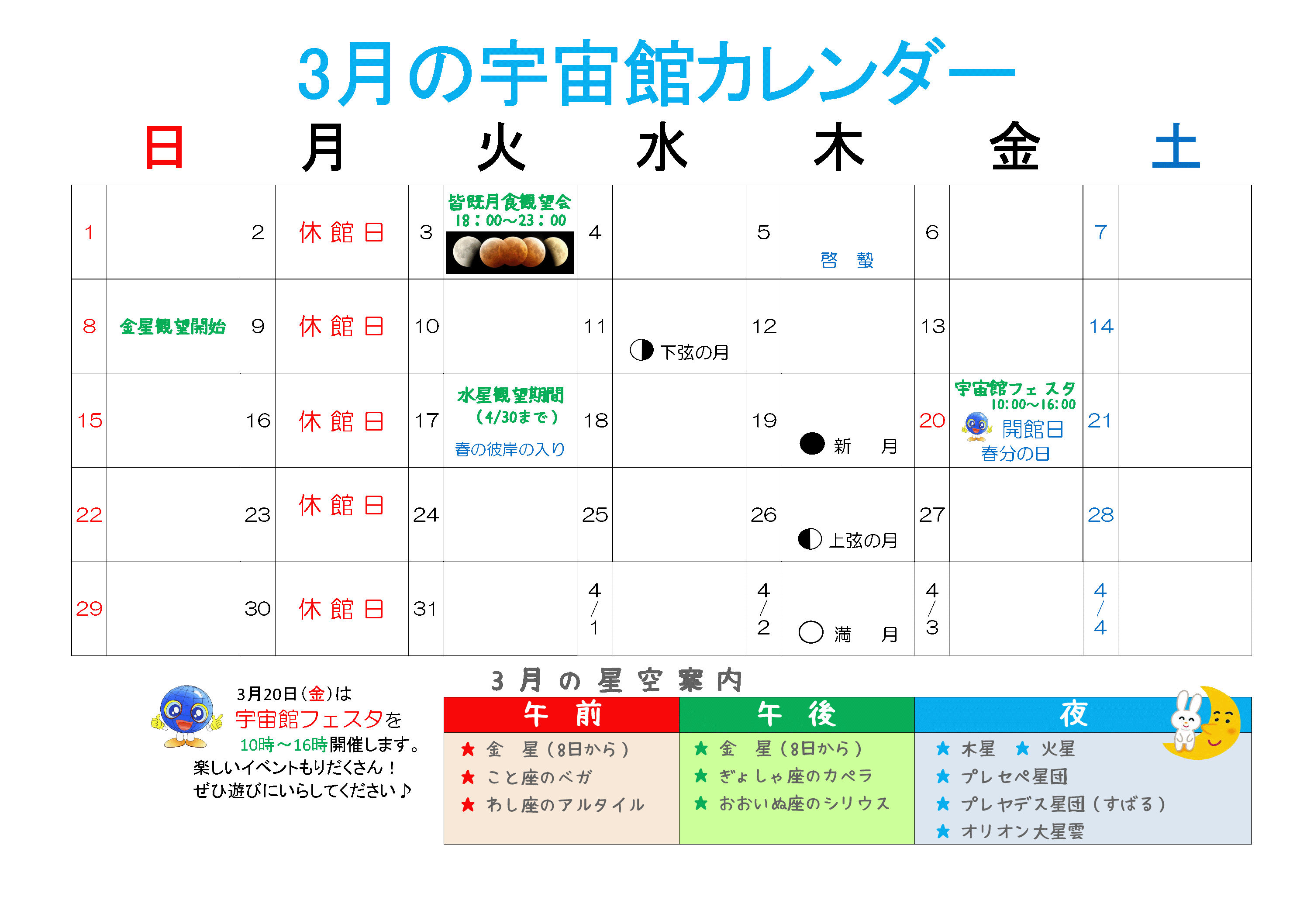 3月の宇宙館カレンダー